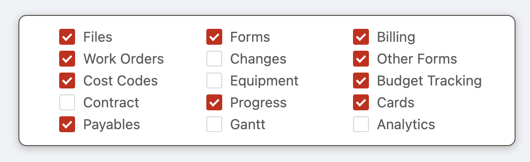 Here you will see a set of checkboxes next to each of the available tabs or pages in the project profile. To show a page, simply check the box and to hide a page, simply uncheck the box. Any changes you make will be applied instantly to all of your project profiles in Ontraccr.