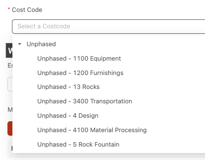 The cost code selection is where you can link the purchase order to any global or project-specific cost codes. Once a purchase order is linked to cost codes, you can distribute the cost of any invoices for the purchase order across the set of cost codes selected in the purchase order.