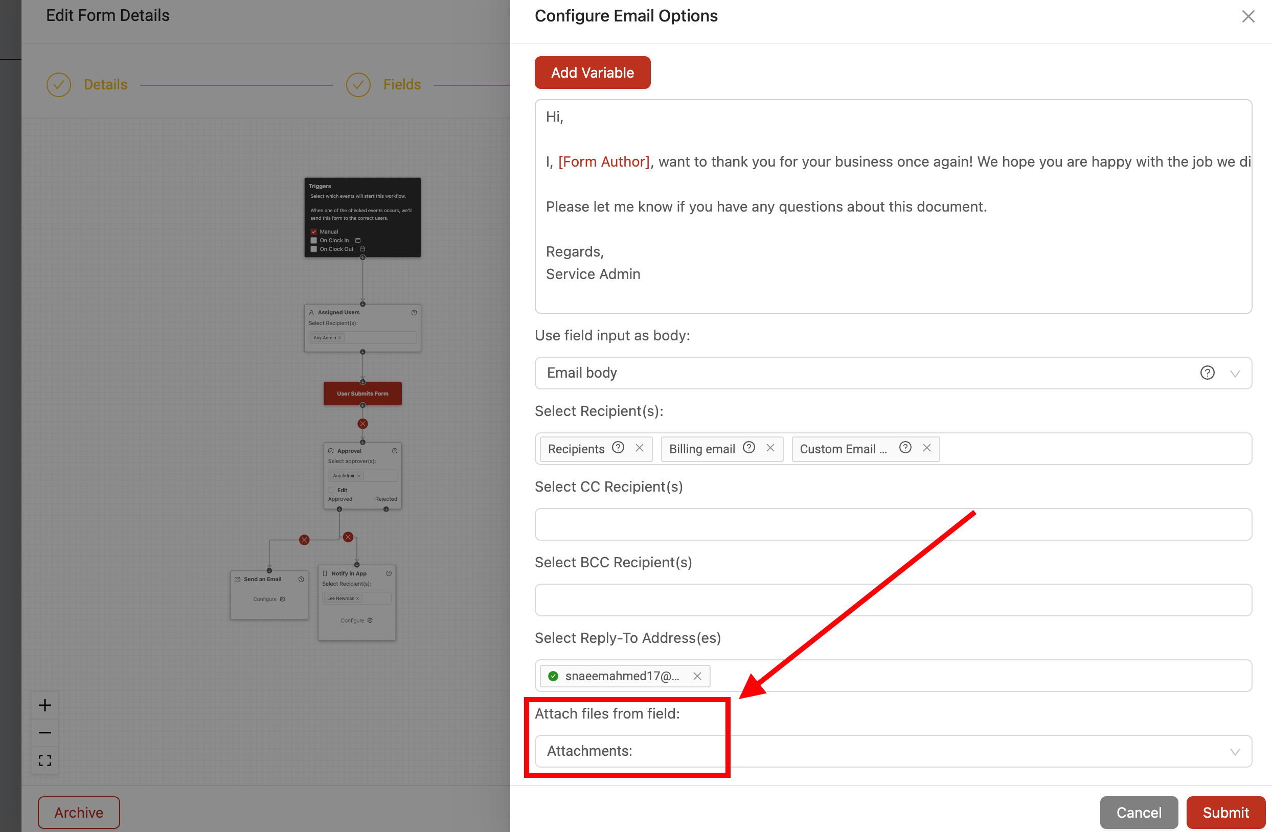 For forms that use 'attachment' fields combined with the 'Send an Email' step, you can now configure the workflow's email to directly attach the files added to the form's attachment field. This will basically extract the attached files in the form and include them as direct attachments in the automated email itself.