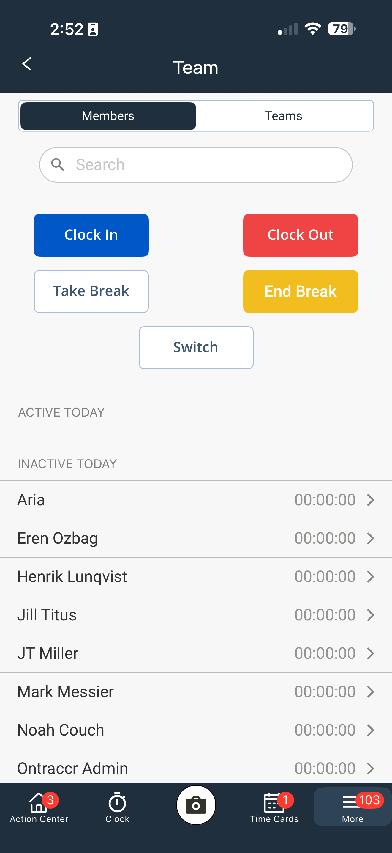 Navigate over to the "Team" page → Select Action (Clock In, Clock Out, Take Break, End Break, Switch) → Select each user individually, or tap "Select All" → Complete remaining actions